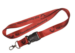 25mm polysatin lanyards with a code104 metal clip and a code304 plastic release buckle. Perfect PMS match.