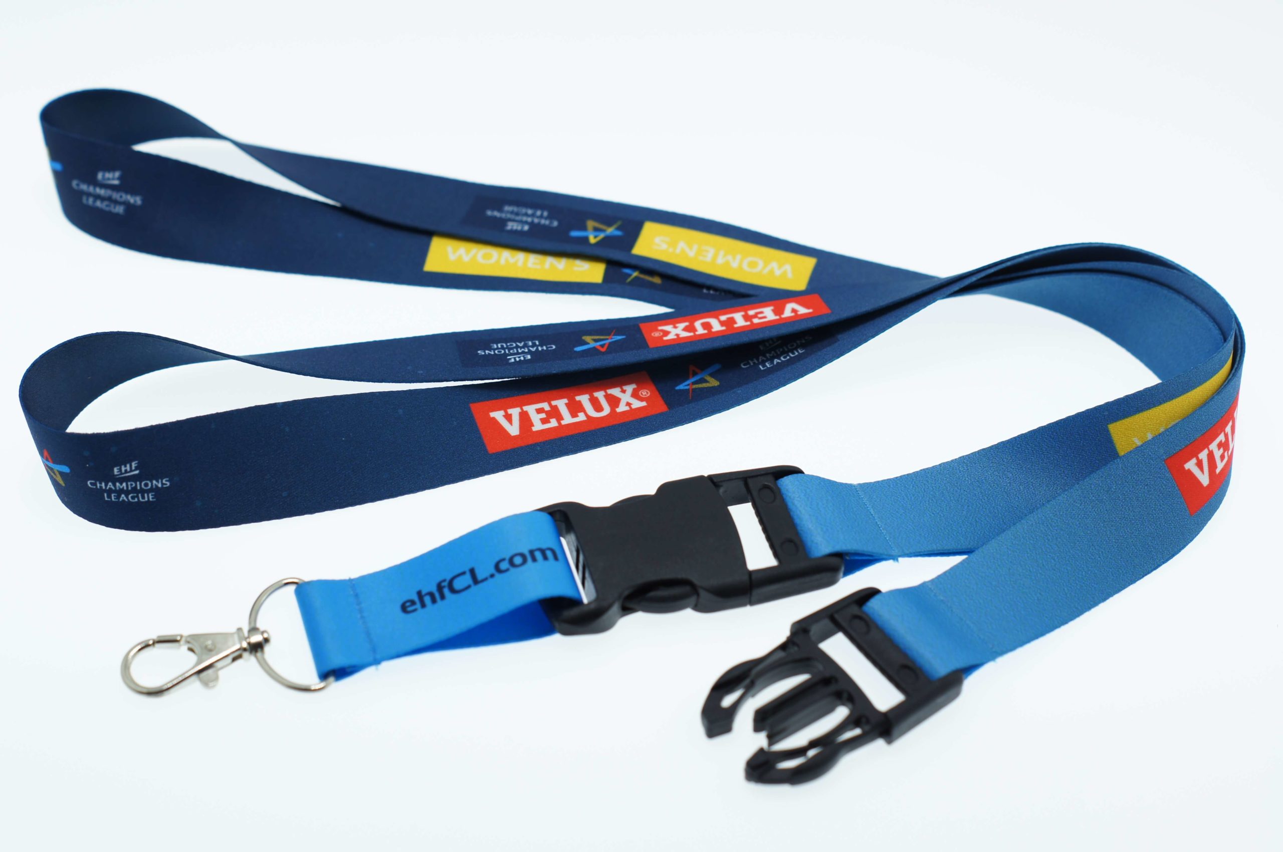 20mm polysatin lanyards with a code104 metal clip and a code304D plastic release buckle. Perfect PMS match.