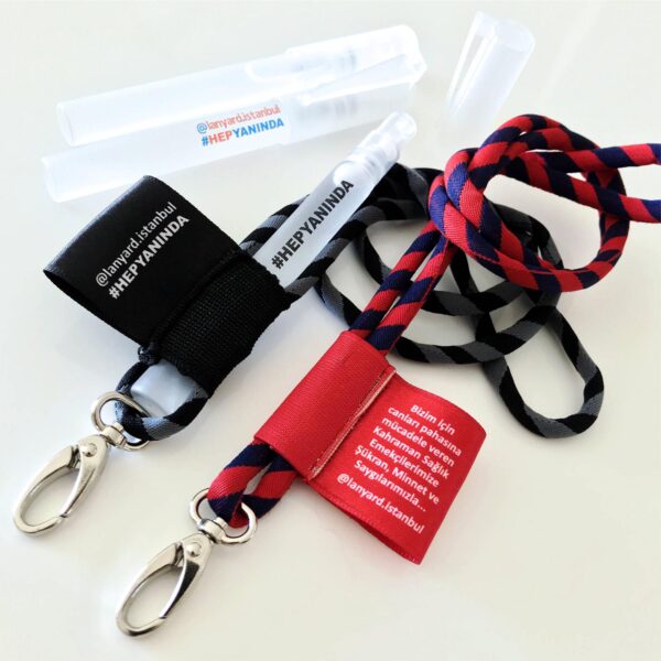 Cylindirical lanyard woven in two colors with an elastic pocket for a 8ml spray pen sanitizer. Logo imprint on the label. Since the sanitizers became a part of our daily life for a while, our lanyards were designed to provide you the fastest access when it’s needed. Easy to carry hanging on your neck.