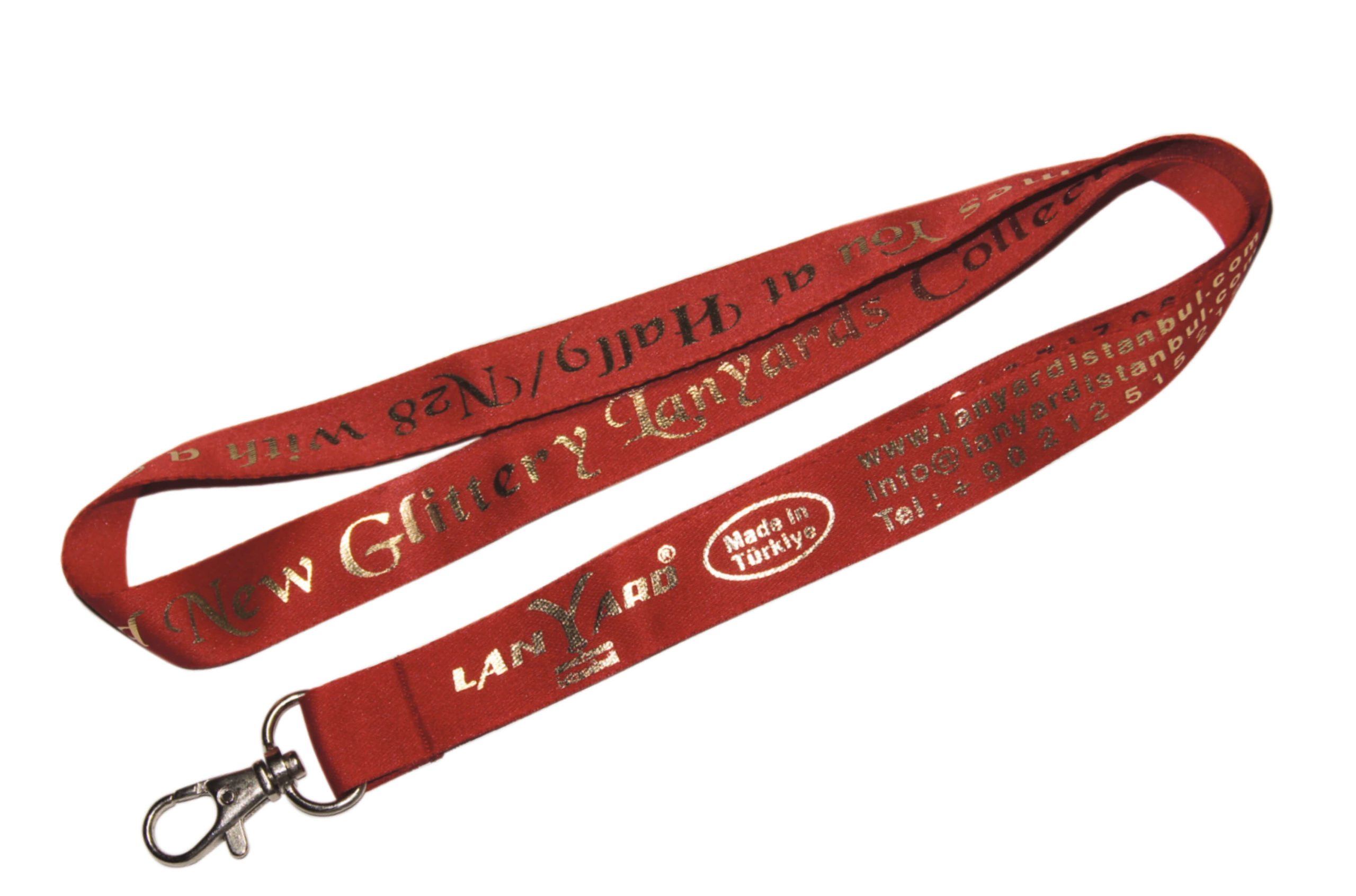 20mm polysatin lanyard with a code104 metal clip. Silkscreen imprint with silver or gold option.