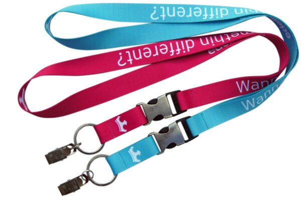 20mm polysatin lanyards with a code101 ring, a code108 metal clip and a code304M metal release buckle. Perfect PMS match.