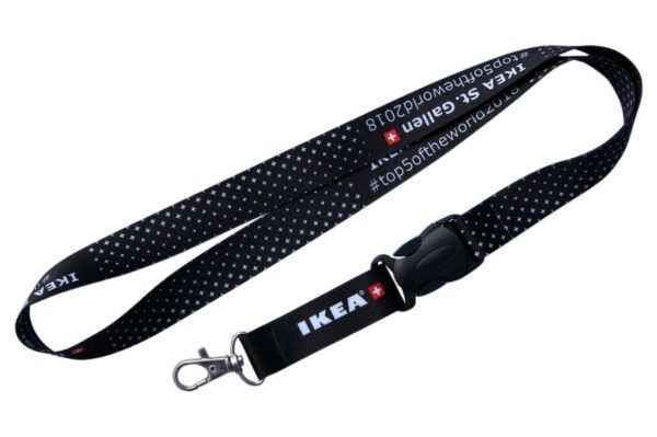 20mm polysatin lanyards with a code104 metal clip and a code304 plastic release buckle. Perfect PMS match.