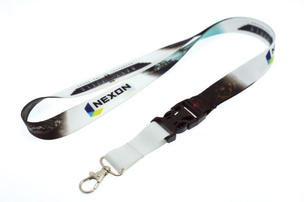 20mm polysatin lanyards with a code104 metal clip and a code304D plastic release buckle. Perfect PMS match.