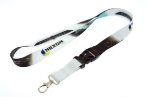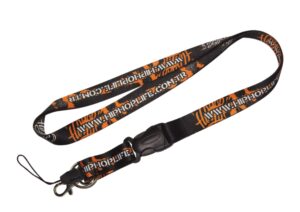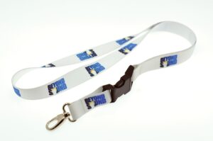 20mm grosgrain lanyards with a code104 metal clip and a code304 plastic release buckle. Embossed logo with one color silk screen imprint.
