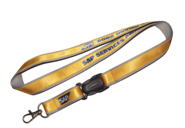 20mm+25mm double layered polysatin lanyards with a code104 metal clip and a code304 plastic release buckle. Perfect PMS match.