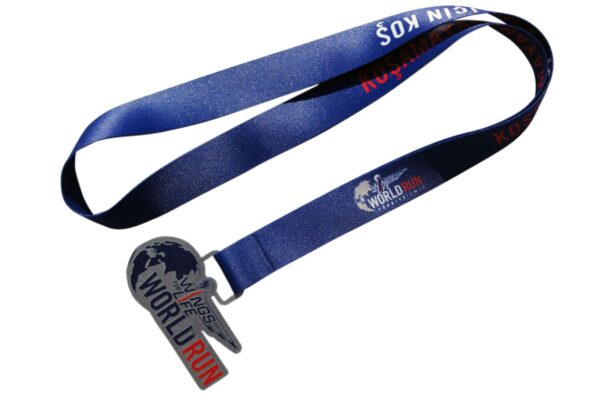 Custom cut, acid engraved metal medal, combined with 25mm lanyard.