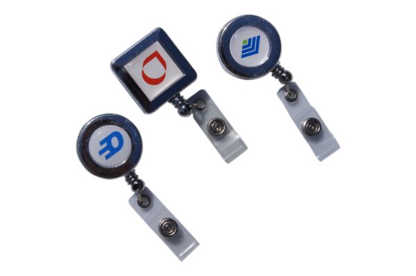 Epoxy domed logo imprinted badge reels with a shiny metal look. Available in circular and square shapes.