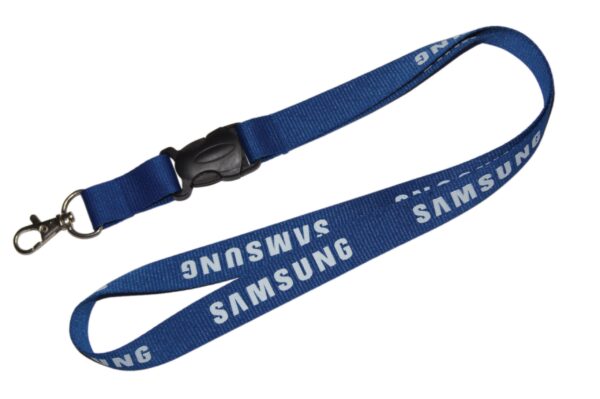 20mm grosgrain lanyards with a code104 metal clip and a code304 plastic release buckle. Embossed logo with one color silk screen imprint.