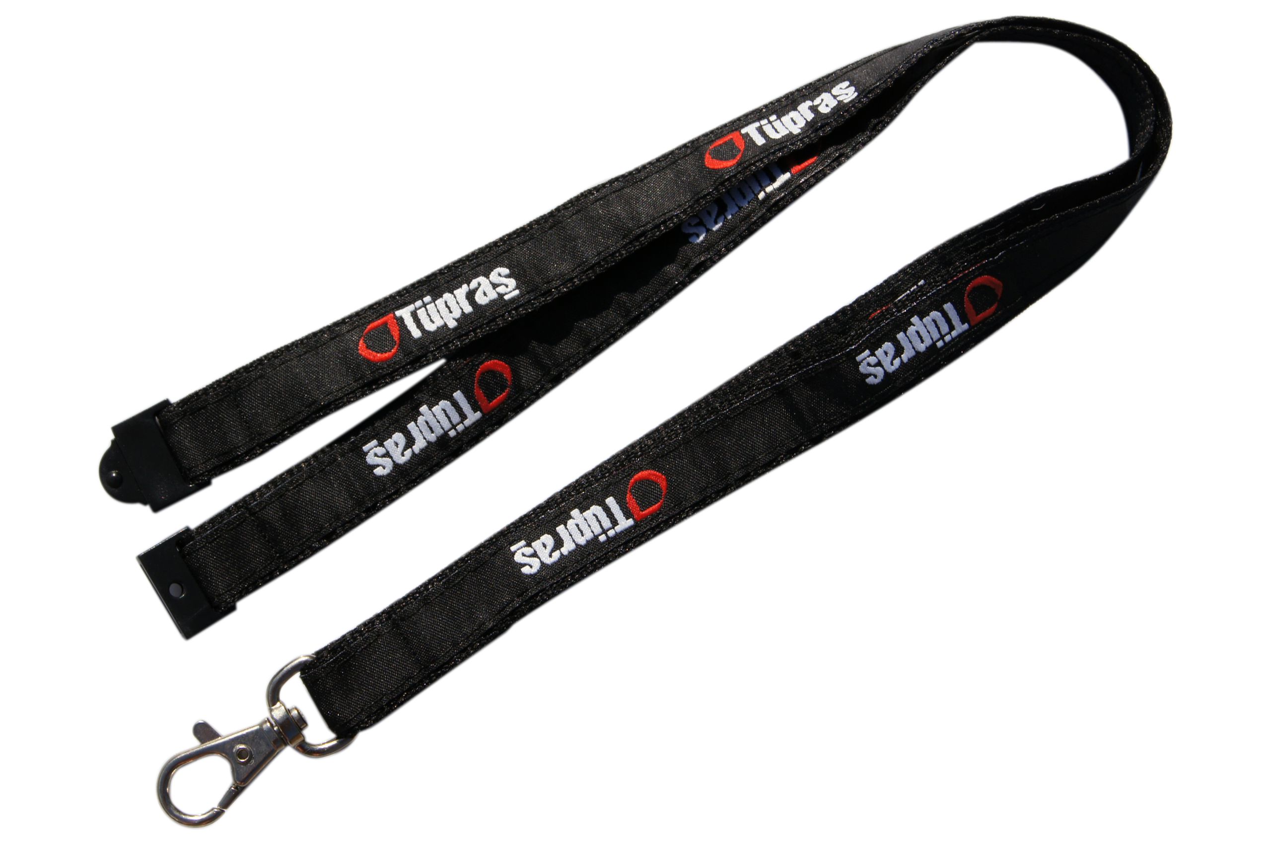 12mm+15mm double layered grosgrain lanyards with a code104 metal clip and a code402 safety clip. The logo is embroidered.